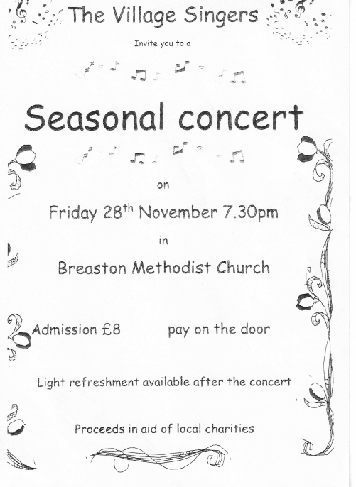 The choir have been invited to sing at Breaston Parish Council Carols and Christmas Lights Switch On at 7:00pm in St. Michael's Church where we will be singing 2 or 3 carols.